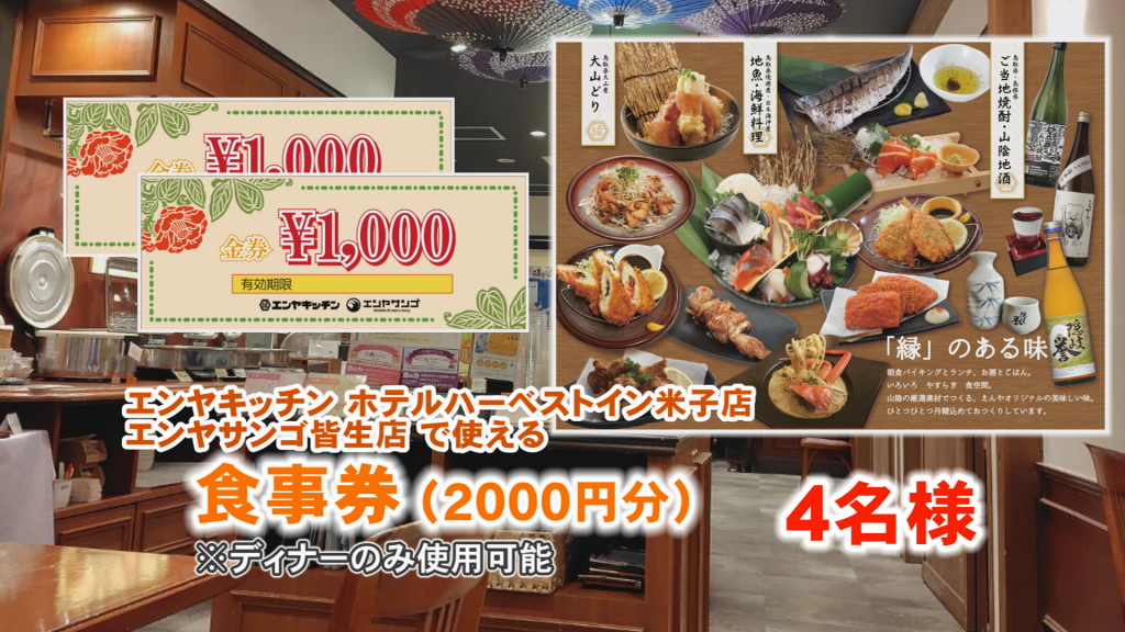 エンヤキッチン ホテルハーベストイン米子店、エンヤサンゴ皆生店で使えるお食事券です。