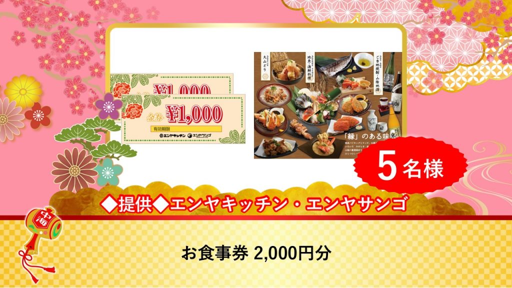 エンヤキッチン・エンヤサンゴのディナー(居酒屋)タイムにご利用できる お食事券 1,000円×2枚です。