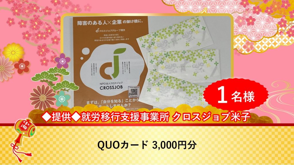 就労移行支援事業所 クロスジョブ米子様からはQUOカード 3,000円分です。