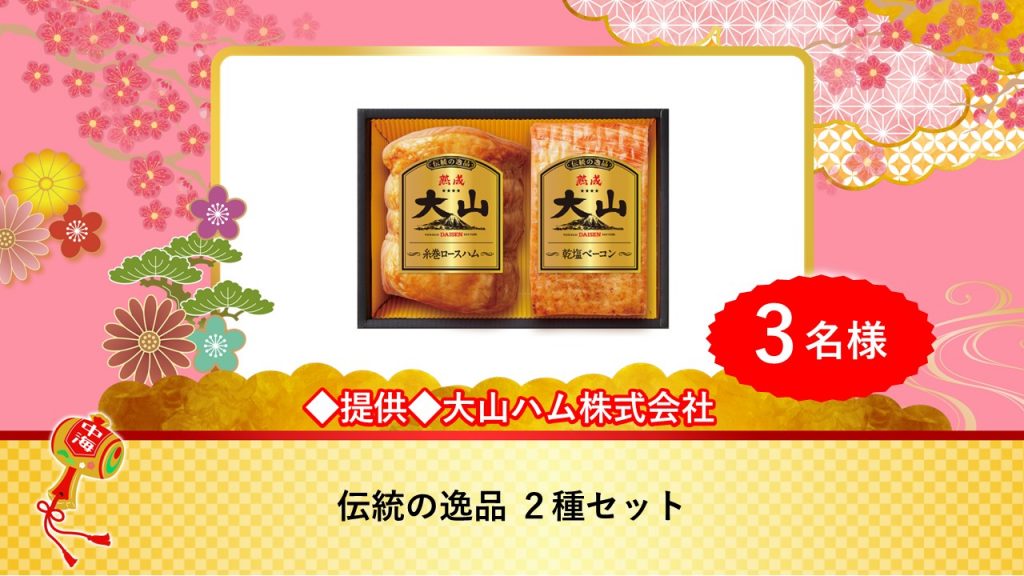 大山ハムの職人が自信をもってつくる熟成シリーズ2品(熟成糸巻ロースハム、熟成乾塩ベーコン)入り。