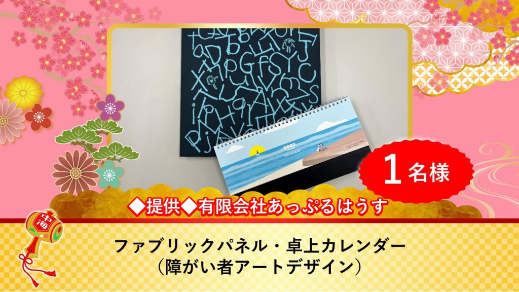 障がいのある方のアートを製品化。パネルは「あかり広場」宮尾様、カレンダーは県内 6 施設の作家作品を採用。