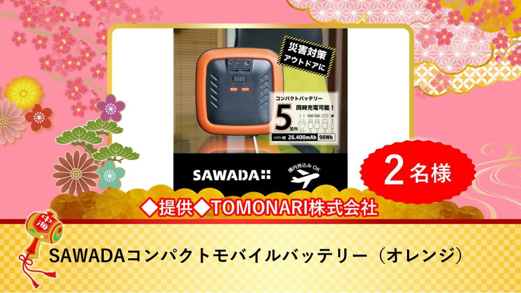 TOMONARI株式会社様からはSAWADAコンパクトモバイルバッテリー(オレンジ)です。