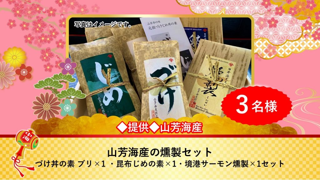 山芳海産様からは山芳海産の燻製セット (づけ丼の素 ブリ×1 ・昆布じめの素×1・境港サーモン燻製×1セット)です。