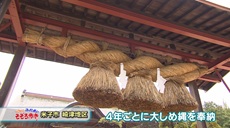 たいていの神社は「こも」で包んでありますが、こちらの神社では、藁を全部よって作られます。しめ縄は4年に1回奉納。現在の大しめ縄は2024年2月に奉納されました。