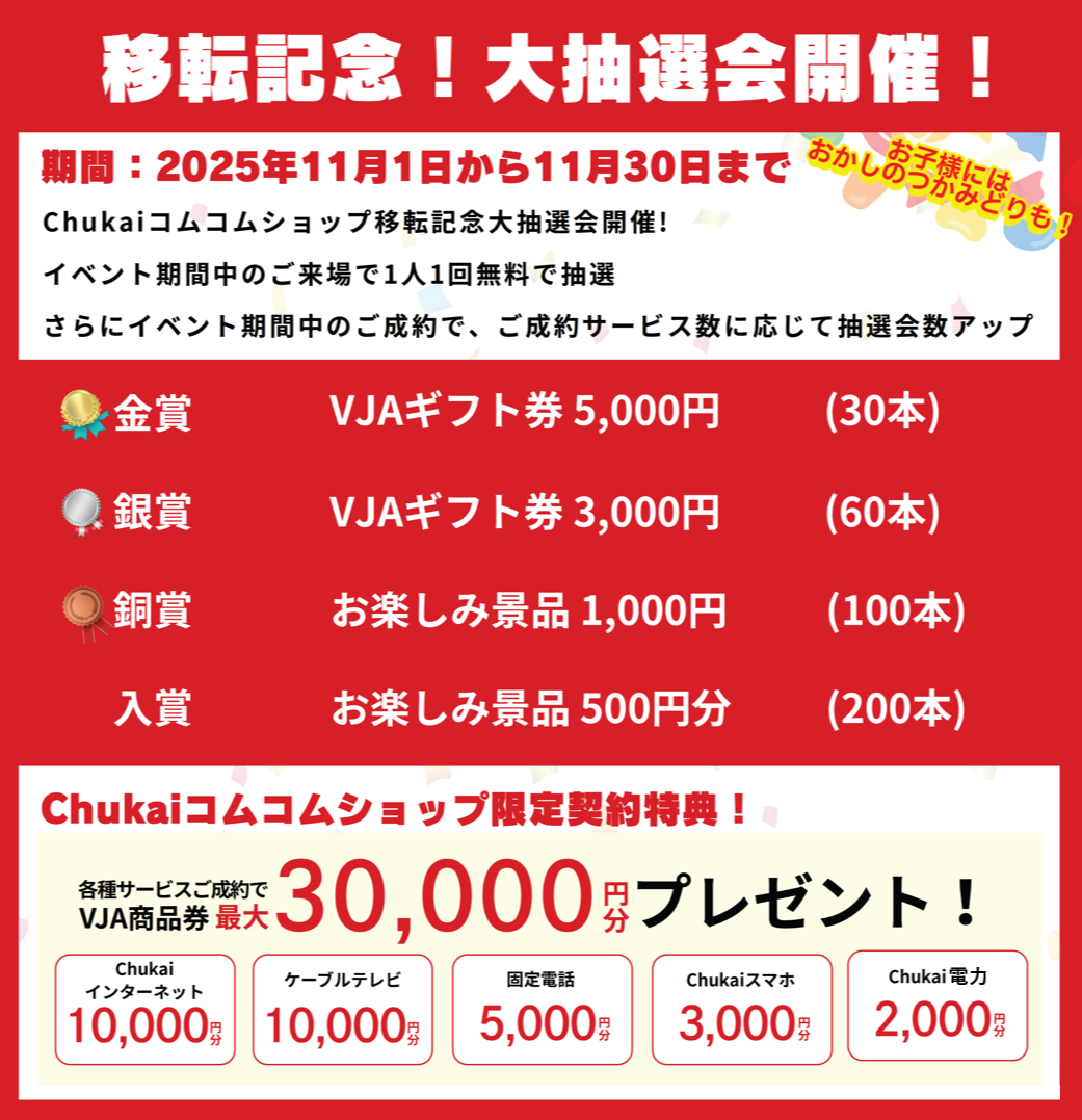 また、プレオープンを記念して、豪華賞品があたる大抽選会をChukaiコムコムショップで開催します。中海テレビ放送LINE公式アカウントに友だち登録している方であれば、どなたでも参加できます。みなさまぜひChukaiコムコムショップへお越しください。