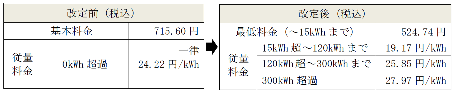 ※ 改定後の最低料金は、ご使用量が15kWh以下の場合、一律524.74円の課金となります。