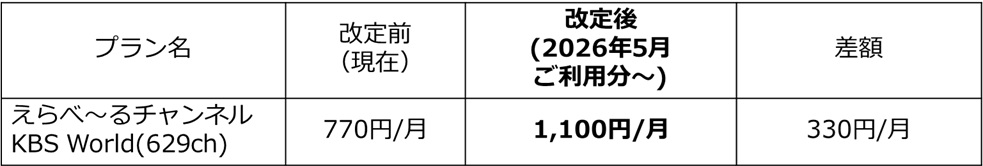 この度、「KBS World」の運営元であるKBS World株式会社において、2026年5月1日(金)より視聴料金の改定が実施されます。つきましては、2026年5月ご利用分(2026年6月ご請求分)より、月額視聴料金を下記の通り改定させていただきます。お客様にはご負担をおかけいたしますが、ご理解を賜りますようお願い申し上げます。