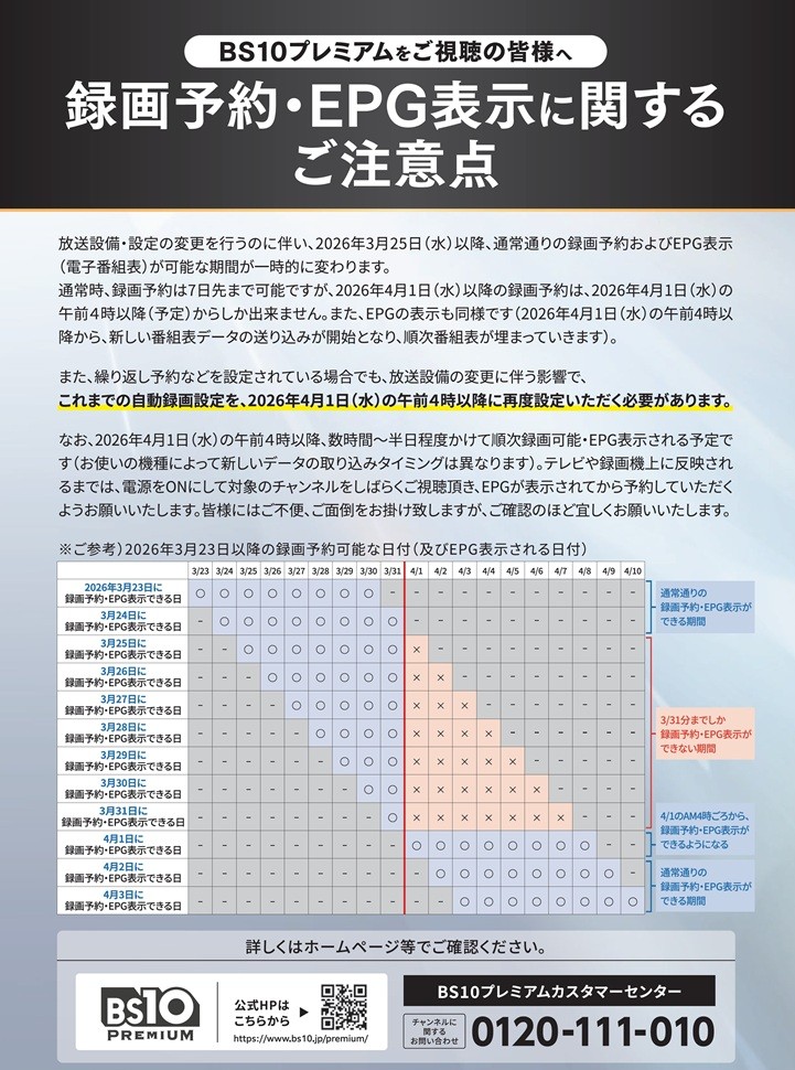 そのため、2026年4月1日以降の番組を予約される場合は、同日午前4時を過ぎて番組表が