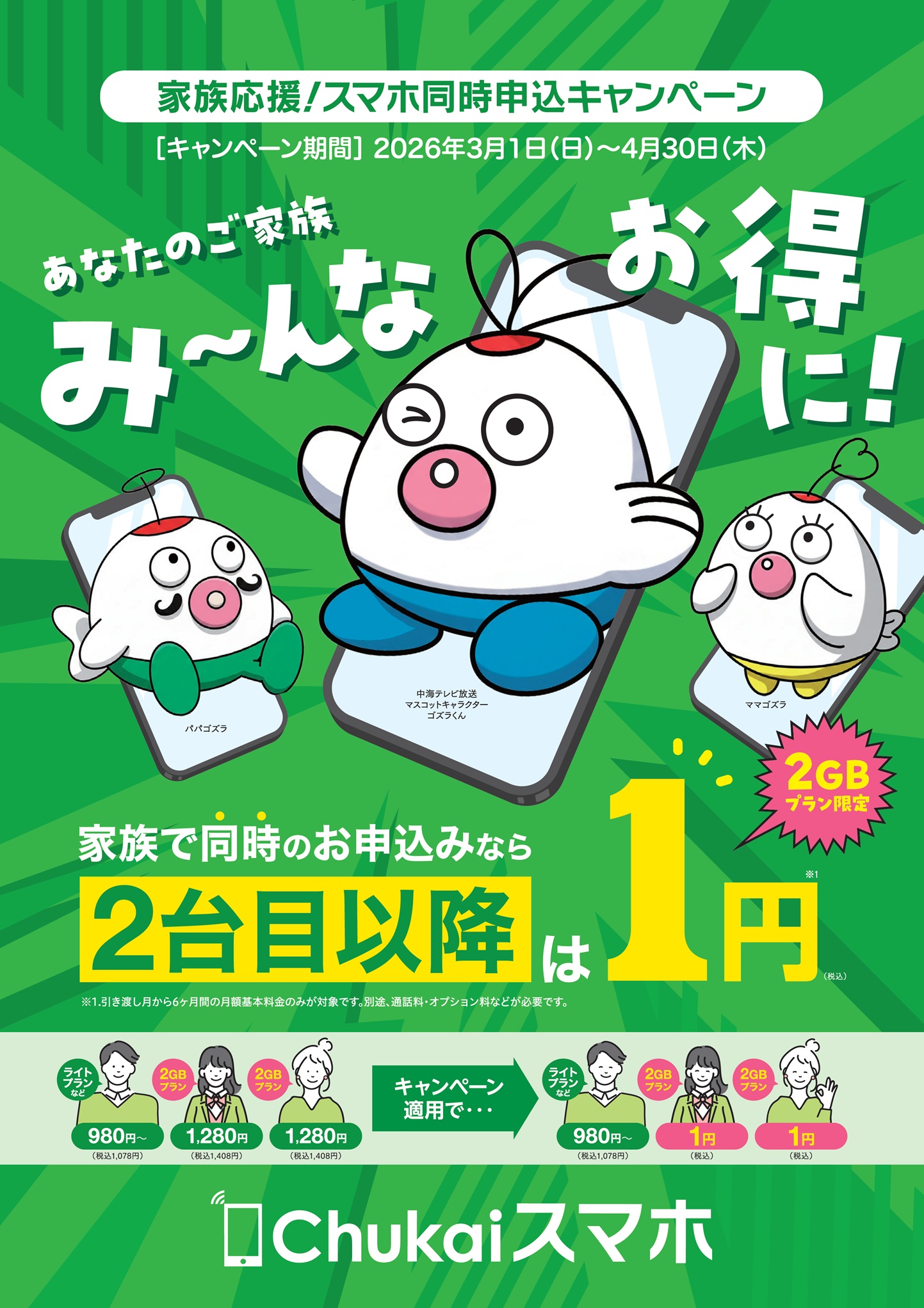 Chukaiスマホでは、『家族応援!スマホ同時申込キャンペーン』を実施中です。