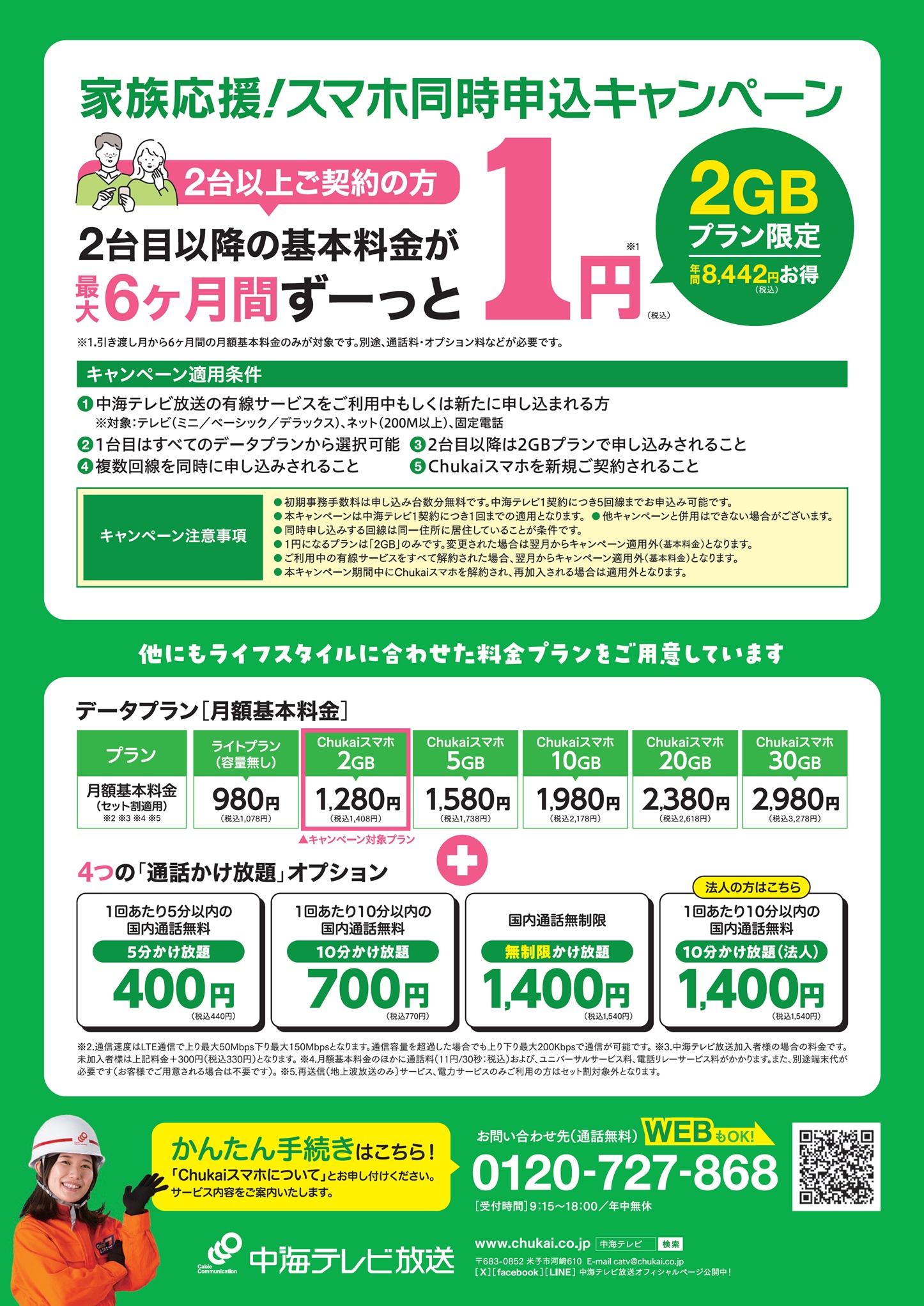 ご家族で同時に「Chukaiスマホ」をお申し込みいただくと、2台目以降の基本料金が最大6ヶ月間ずーっと1円になる大変お得なキャンペーンを実施中です。