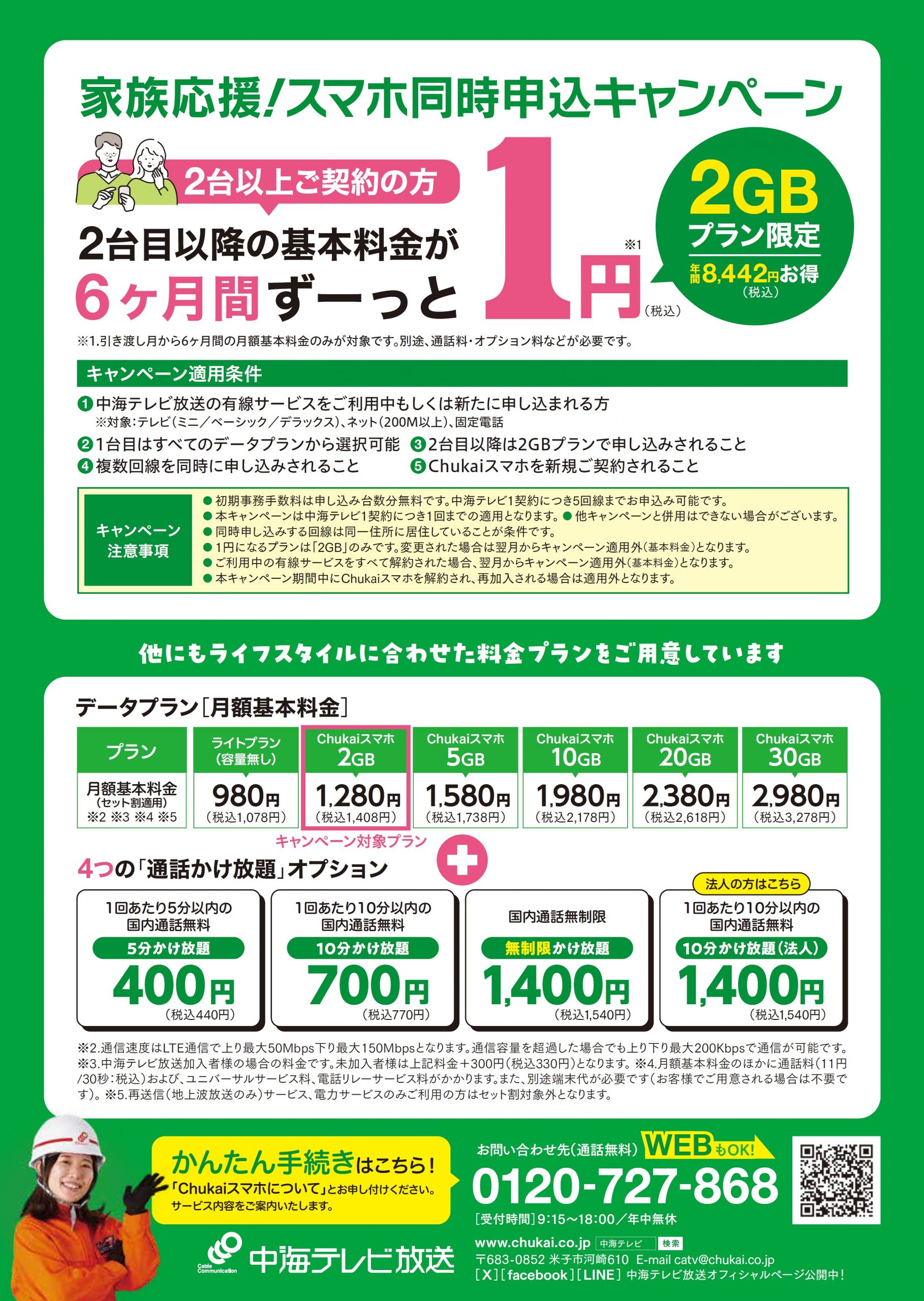ご家族で同時に「Chukaiスマホ」にお申し込みされると、2台目以降の基本料金が6ヶ月間ずーっと1円になります。