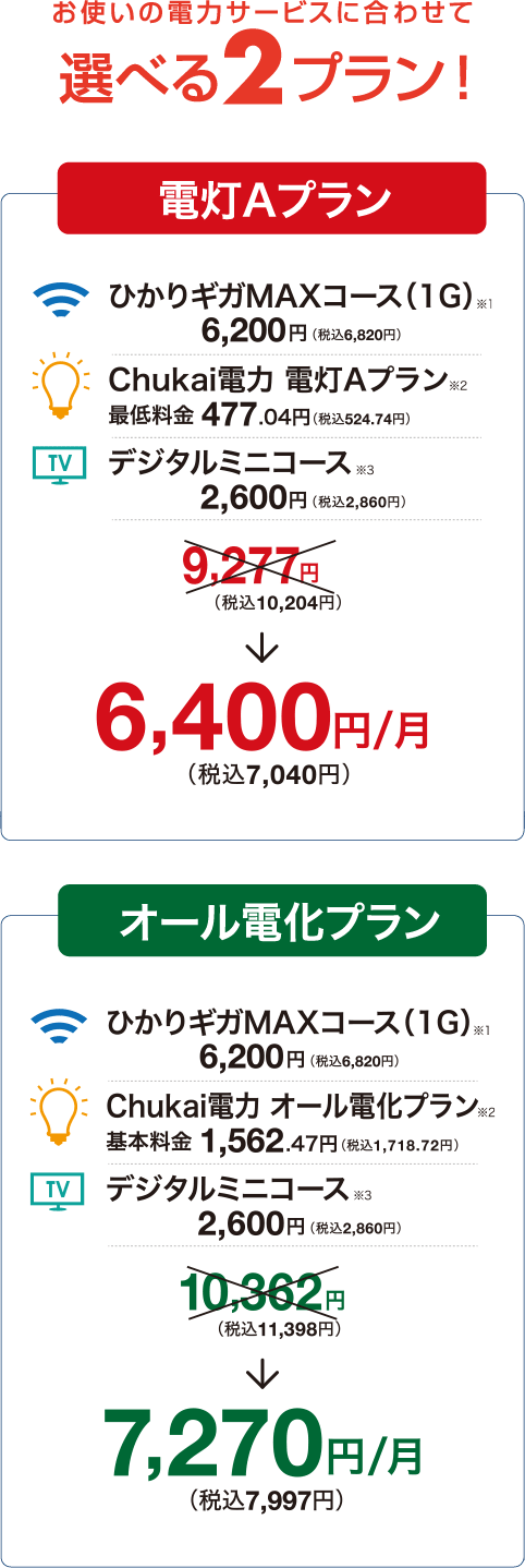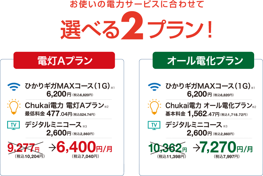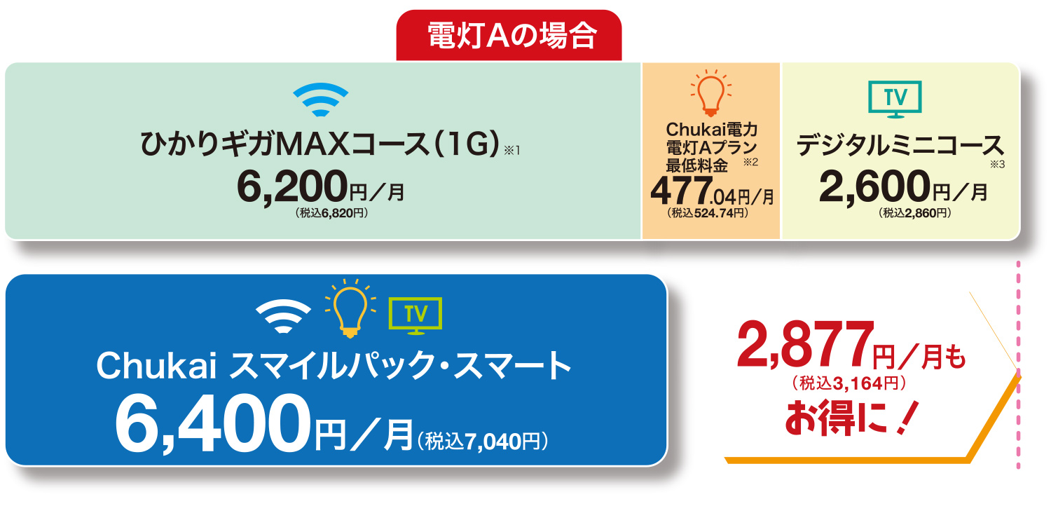 ※2.記載の金額は電気料金のうち基本(最低)料金のみです。別途ご使用状況に応じて電力使用量料金、燃料費調整額、再生可能エネルギー発電促進賦課金が発生します。※3.Chukaiスマイルパック・スマートのデジタルミニコースは1台のみとなります。2台目以降の追加やデジ録は追加料金がかかります。